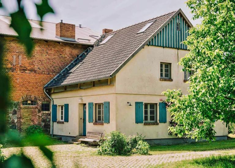 Die Einrichtung besteht aus Möbeln und Accessoires aus den 1930er Jahren. Die mit alten Mauersteinen gepflasterte Terrasse mit Feuerschale und Grill und der umgebende Hausgarten bieten viel Platz zum Verweilen unter Obstbäumen oder dem Holunderbusch.